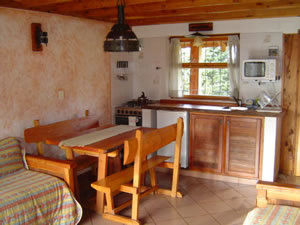 Es una cabaña de dos ambientes con dormitorio matrimonial y dos sofá camas en la sala debajo de los cuales se pueden sacar hasta dos camas mas. Tiene hidromasaje y secador de cabello en el baño, cocina con horno, microondas, heladera y toda la vajilla necesaria. Los servicios incluyen TV 21" en sala y otro en la habitacion, cable, DVD con el que se pueden ver películas o escuchar Cds de música, teléfono con número propio local, conexión a internet por banda ancha Wi Fi, caja de seguridad, teléfono, servicio de mucama y ropa blanca. La vista al lago es total y el acceso es por la cocina o por el frente en la terraza principal. |