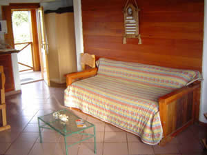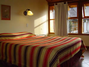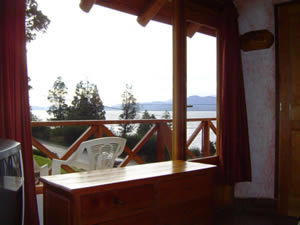 Es una cabaña de dos ambientes con dormitorio matrimonial y dos sofá camas en la sala debajo de los cuales se pueden sacar hasta dos camas mas. El baño tiene hidromasaje y secador de cabello. Tiene cocina con horno, microondas, heladera y toda la vajilla necesaria. Los servicios incluyen TV 21" pantalla plana en la sala y otro en la habitacion, cable, DVD con el que se pueden ver películas o escuchar Cds, conexión a internet por banda ancha Wi Fi, caja de seguridad, servicio de mucama y ropa blanca. La vista al lago es total. |